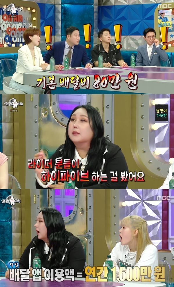 이날 풍자는 "1년치 배달 음식을 얼마나 시켰는지 대결을 한 적이 있었다. 거기서 제가 1등을 차지했다"고 밝혔다. 이어 "한 개의 배달 어플에서 1년에 1600만 원, 다른 플랫폼까지 보니까 배달비로만 3000만 원 이상이더라. 배달 음식만"이라고 해 놀라움을 안겼다.
