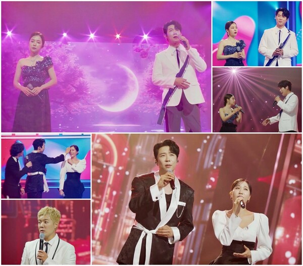 반면 손태진, 홍자와 맞붙은 에녹과 별사랑은 ‘어른 섹시’ 무대로 넘치는 고혹미를 발산한다. 두 사람의 무대는 “너무 섹시하다”, “잘 됐으면 좋겠다”, “결혼할 것 같다”라는 찬사를 받은 상황. 더욱이 무대가 끝난 후 에녹이 별사랑을 향해 아슬아슬한 돌발행동을 보이면서 현장을 초토화시킨다. 이에 강남이 “키스신 있는 줄 알았어요! 있었으면 시청률 대박일 텐데”라며 못 말리는 아쉬움을 표출하면서, 두 사람의 엔딩포즈는 무엇인지, 분위기를 후끈 달군 에녹과 별사랑의 무대가 호기심을 자아낸다.