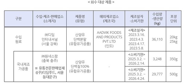 식품의약품안전처(이하 식약처)는 ㈜디딤인터내셔널(서울 강북구 소재)이 수입∙판매한 ‘산양유 단백 분말(식품유형: 유함유가공품)’과 이 제품을 원료로 ㈜원네스팜(충북 충주시 소재)이 제조하고 ㈜디딤푸드(서울 동대문구 소재)가 판매한 ‘산양유단백질100%(식품유형: 유함유가공품)’ 제품에 알레르기 유발 물질인 ‘우유’가 표시되지 않은 사실을 확인하고, 해당 제품의 판매를 중단하고 회수 조치한다고 밝혔다.