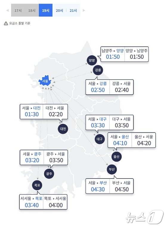 서울부터 지방까지는 △부산 4시간 30분 △울산 4시간 10분 △대구 3시간 30분 △강릉 2시간 50분 △양양 1시간 50분(남양주 출발) △대전 1시간 30분 △광주 3시간 20분 △목포 3시간 40분이다.