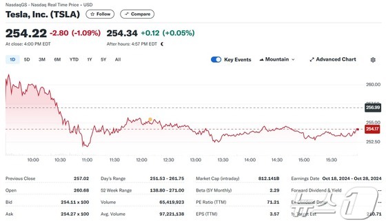 26일(현지시간) 뉴욕증시에서 테슬라는 전거래일보다 1.09% 하락한 254.22달러를 기록했다.