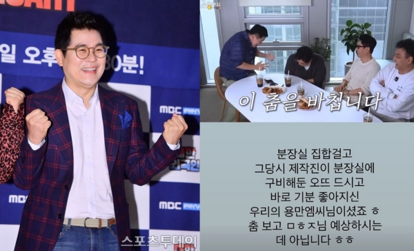 이어 "용만이형이 '잠깐만. 녹화 끊어' 하고 작가, PD들이 전부 용만이형 방에 갔다. 난리가 난 거다. 그 게스트 분도 짬이 있으니까 눈치를 챈 거다. 다시 용만이형이 들어오니까 게스트 분이 막 (춤을 췄다.) 용만이형 앞에서"라며 당시 춤을 재연해 웃음을 자아냈다.