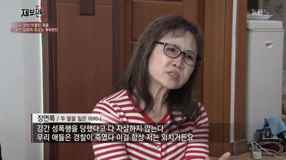 장 씨는 "딸이 조사를 받고 경찰서 밖으로 나와 8차선 도로에 뛰어들기도 했다"며 "옆에서 (가해자한테) 다 들리는데 (성폭행 당시를) 그대로 묘사하고 신음까지 내라고 했다. 강간, 성폭행당했다고 다 자살하진 않는다. 우리 애들은 경찰이 죽였다고 저는 항상 외친다"고 울분을 토했다.