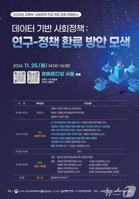 교육부는 25일 서울 중구 르메르디앙호텔에서 '데이터 기반 사회정책 : 연구-정책 환류 방안 모색'을 주제로 공개 토론회를 개최한다고 24일 밝혔다. 한국경제학회, 한국교육학회, 한국사회학회, 한국정책학회, 한국행정학회 등 사회정책 분야 5개 주요 학회와 공동으로 개최한다.