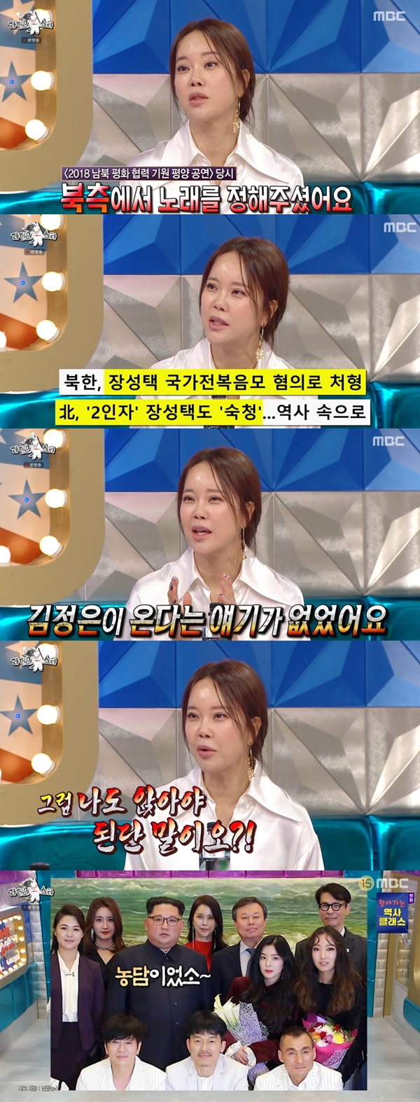 이날 백지영은 "'총 맞은 것처럼' 노래는 북측에서 정해줬다. 당시 누가 처형을 당한 기사가 났었다. 그 일이 있고 난 뒤 왜 나한테 이 노래를 불러달라 했을까 싶었다"고 말했다.