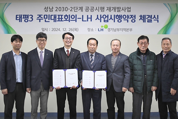 한국토지주택공사(LH)는 26일 LH 경기남부지역본부에서 성남 신흥3주민대표회의·태평3주민대표회의와 신흥3구역·태평3구역 재개발 사업시행약정을 체결했다.