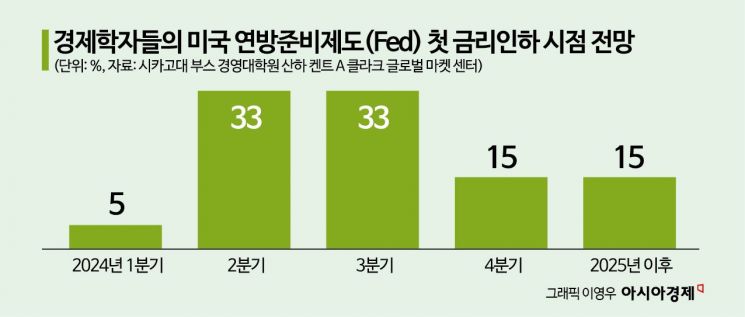 8일 시카고대 부스 경영대학원 산하 켄트 A 클라크 글로벌 마켓 센터가 지난 1~4일 경제학자 40명을 대상으로 설문조사를 실시한 결과 응답자의 63%는 Fed가 내년 3분기나 그 이후에 금리를 인하할 것이라고 답했다.