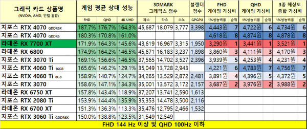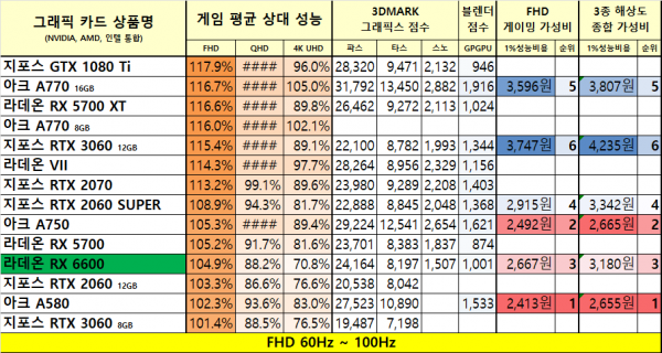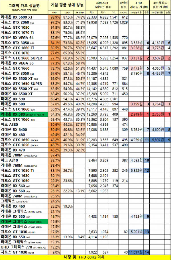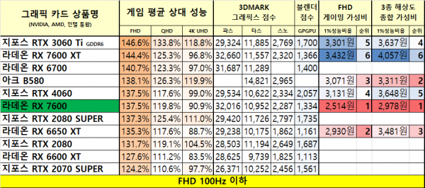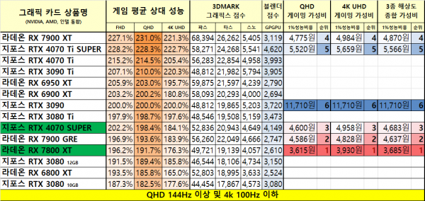 1월 그래픽카드 가성비 비교표 요약본