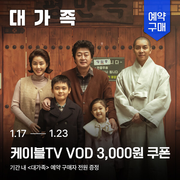 ㈜홈초이스는 ‘대가족’의 VOD 서비스를 앞두고 특별한 예약구매 이벤트를 오늘(17일)부터 23일까지 진행한다. 이번 프로모션을 통해 전국 케이블TV 가입자들은 정식 공개에 앞서 영화 '대가족'을 미리 구매할 수 있으며, 예약자 전원에게 VOD 3,000원 쿠폰이 제공된다.
