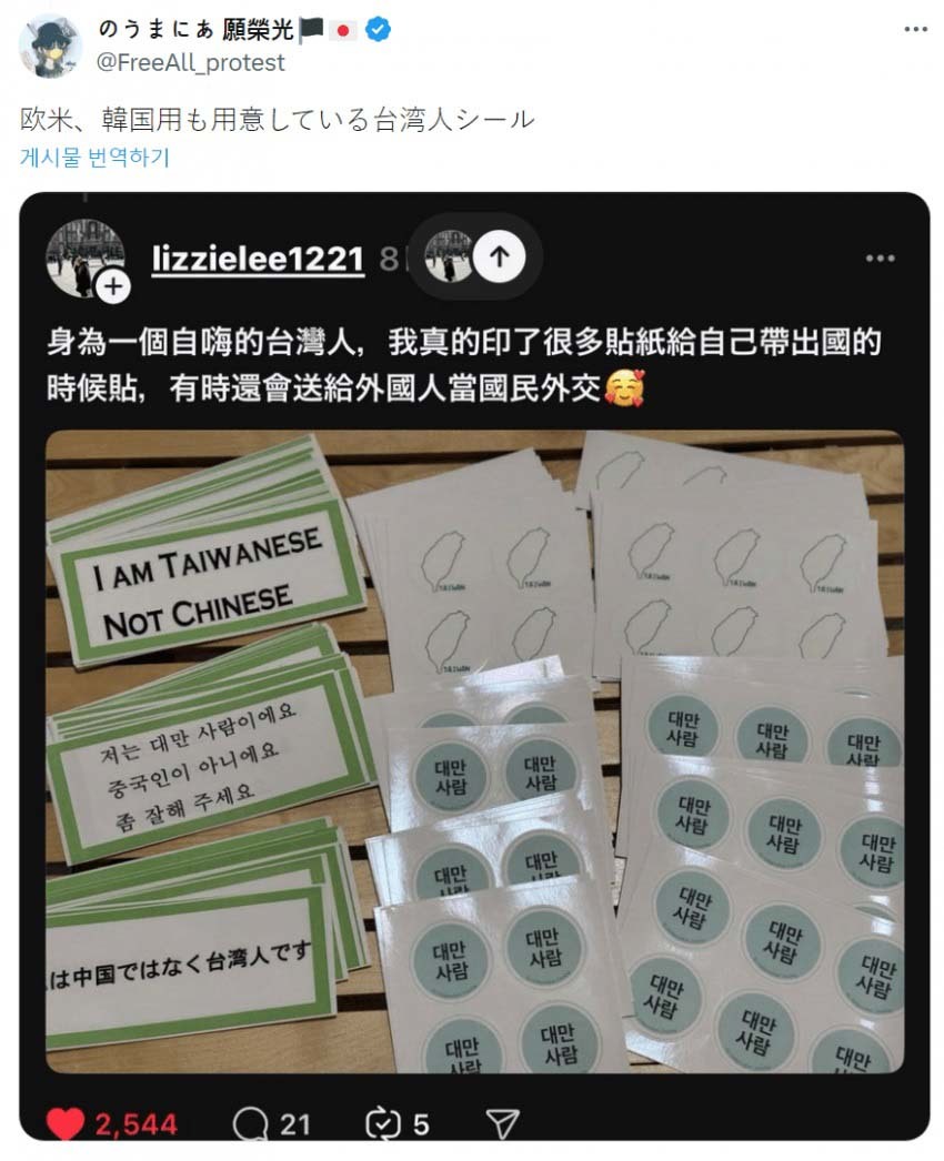 스티커에는 "저는 대만 사람이에요. 중국인이 아니에요. 좀 잘해주세요", "대만 사람"이라는 문구가 한국어, 영어, 일본어 등 여러 언어로 적혀 있다.