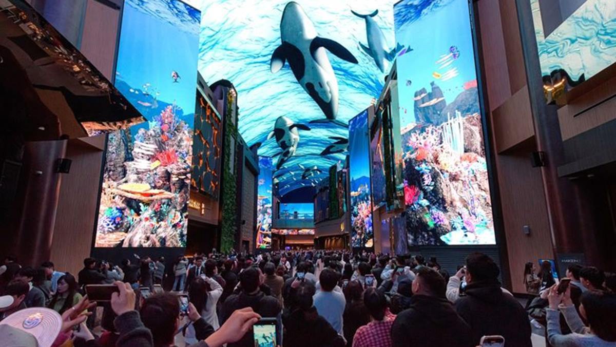 오로라는 총길이 150m, 높이 26m의 천장과 벽면(기둥)에 고화질 LED 사이니지를 설치해 3D 콘텐츠를 선보이는 거리다.