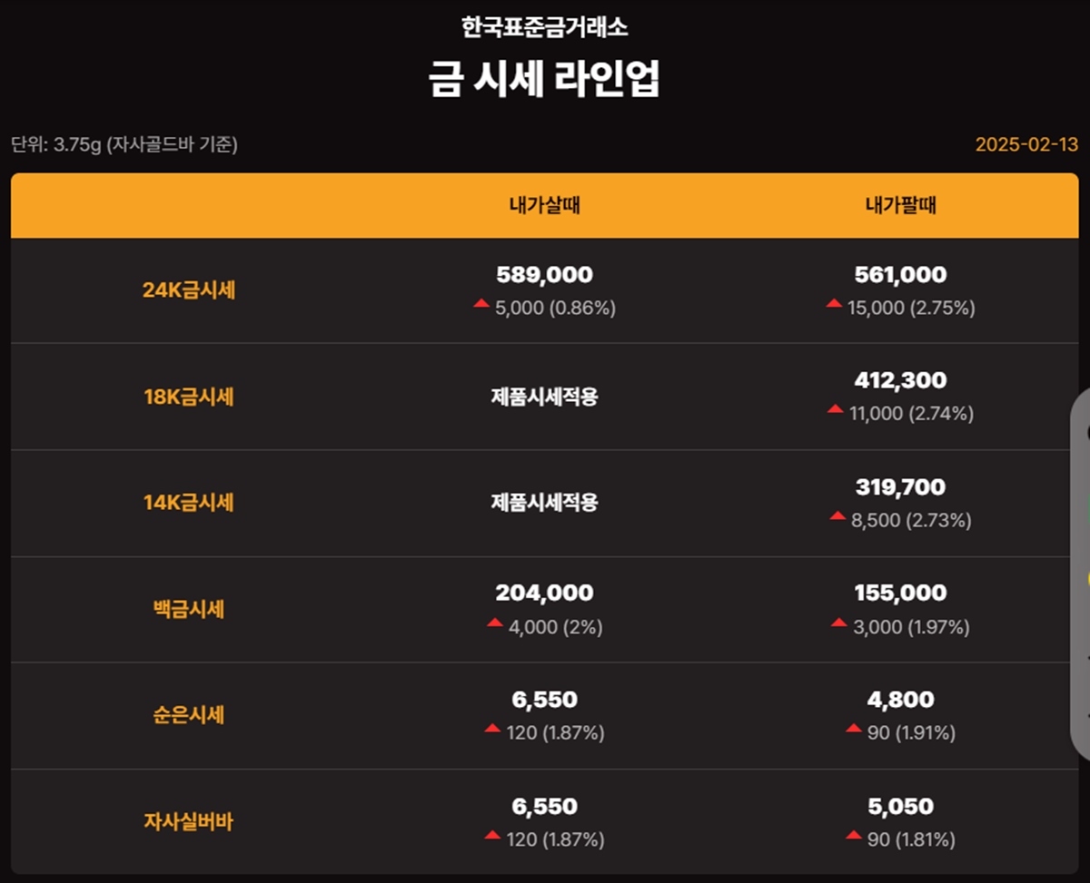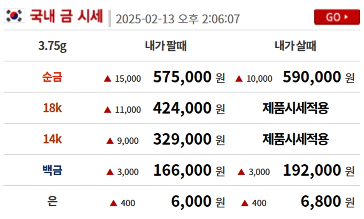 국내 금시세(금값)가 13일 오후 상승세(전 거래일 대비)를 보이고 있다.