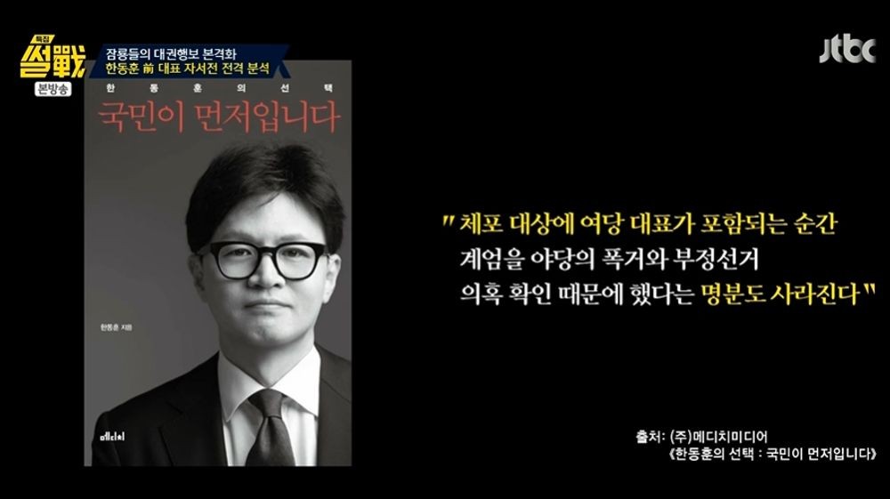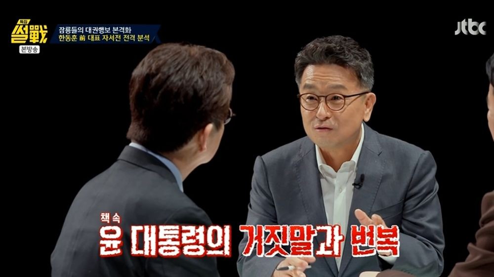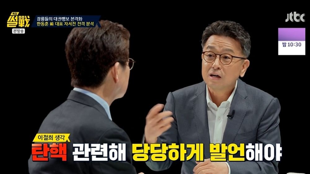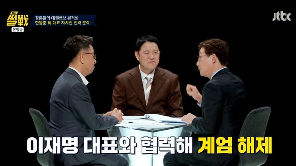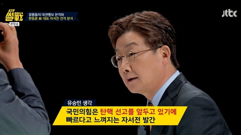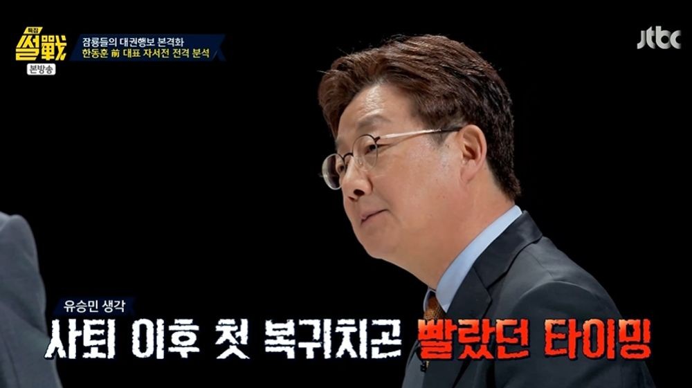 이어 김구라가 "탄핵 결과가 나오기 전부터 자서전 출간하고 활동하는 자체가 섣부르단 비판의 목소리가 있다"고 하자 유승민은 "한 전 대표가 정치하는 건 시비 걸 수 없다고 생각한다. 근데 출판 날짜 타이밍은 좀 빨랐다 싶다. 우리 당은 우리가 배출한 대통령이 탄핵 심판 결정을 앞두고 카운트다운에 들어간 입장"이라고 밝혔다. 반면 이철희는 "전 (지금) 나오는 게 맞다고 본다. 당내는 어차피 소란스럽고, 얘기를 안 들어준다"면서 "한동훈 측근이 자서전에 대해 조언을 구하길래 내야 한다고 했다"고 전했다.