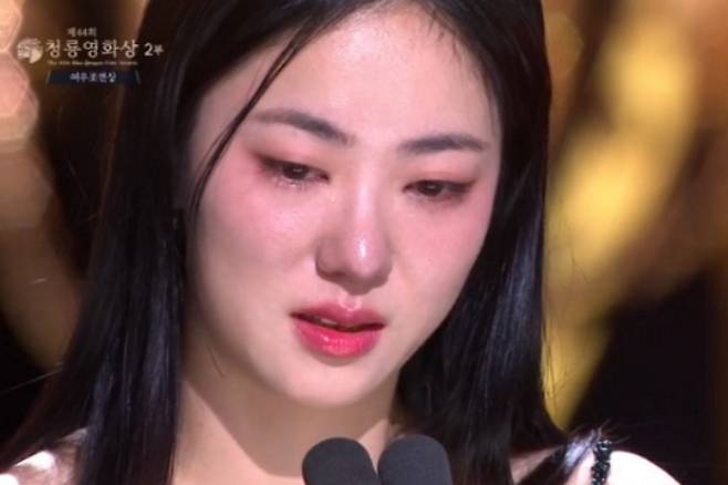 영화 '거미집'으로 수상의 영예를 얻은 전여빈은 수상 소감 도중 "너무 떨려서 심장이 아프다"라고 말하며 눈물을 흘렸죠.