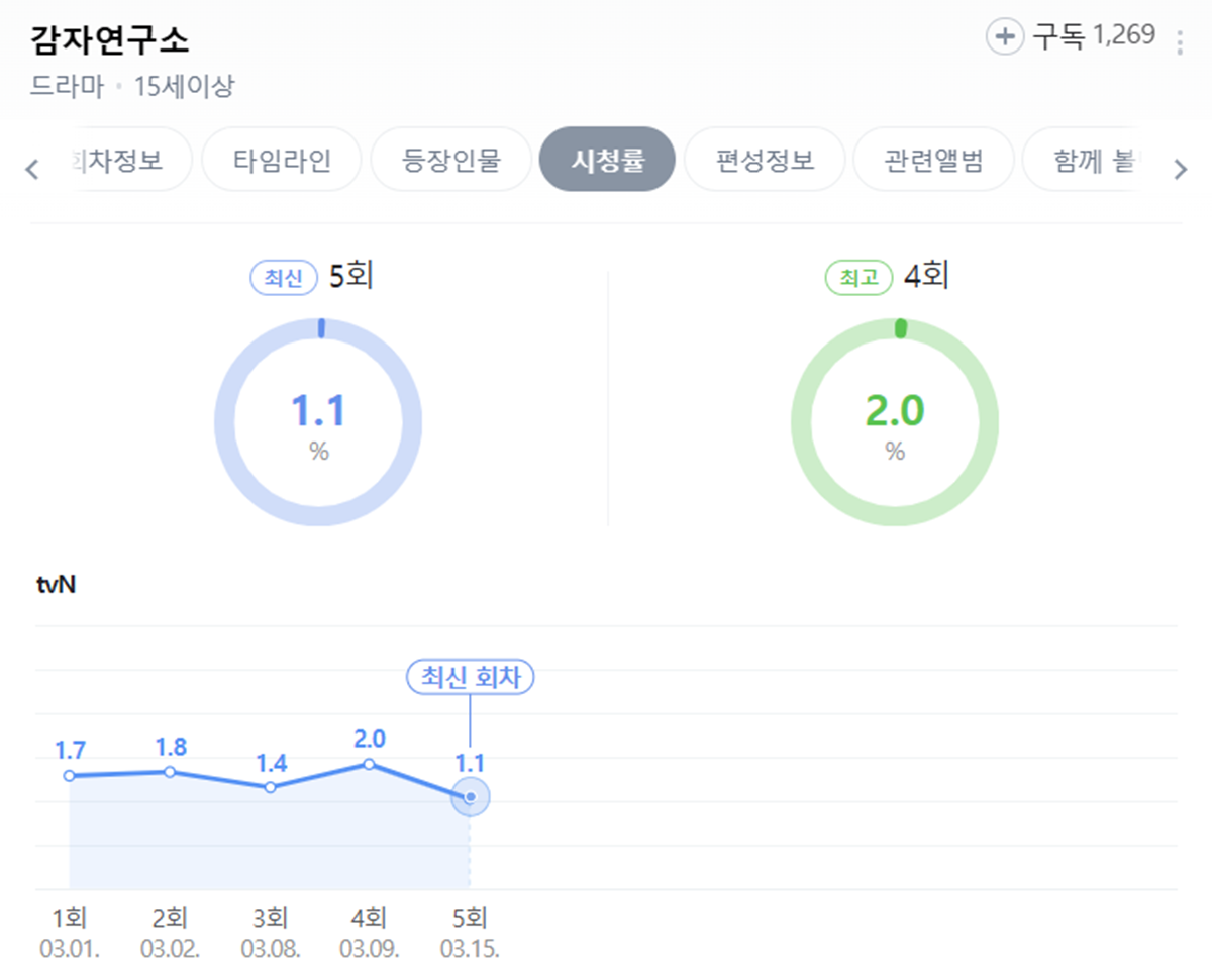 16일 시청률 조사회사 닐슨코리아에 따르면 전날 방송된 tvN 토일드라마 ‘감자연구소’(연출 강일수·심재현, 극본 김호수) 5회 시청률은 유료플랫폼 전국 기준 1.1%, 수도권 기준 1.1%를 기록했다. 이는 자체 최저 시청률이다.
