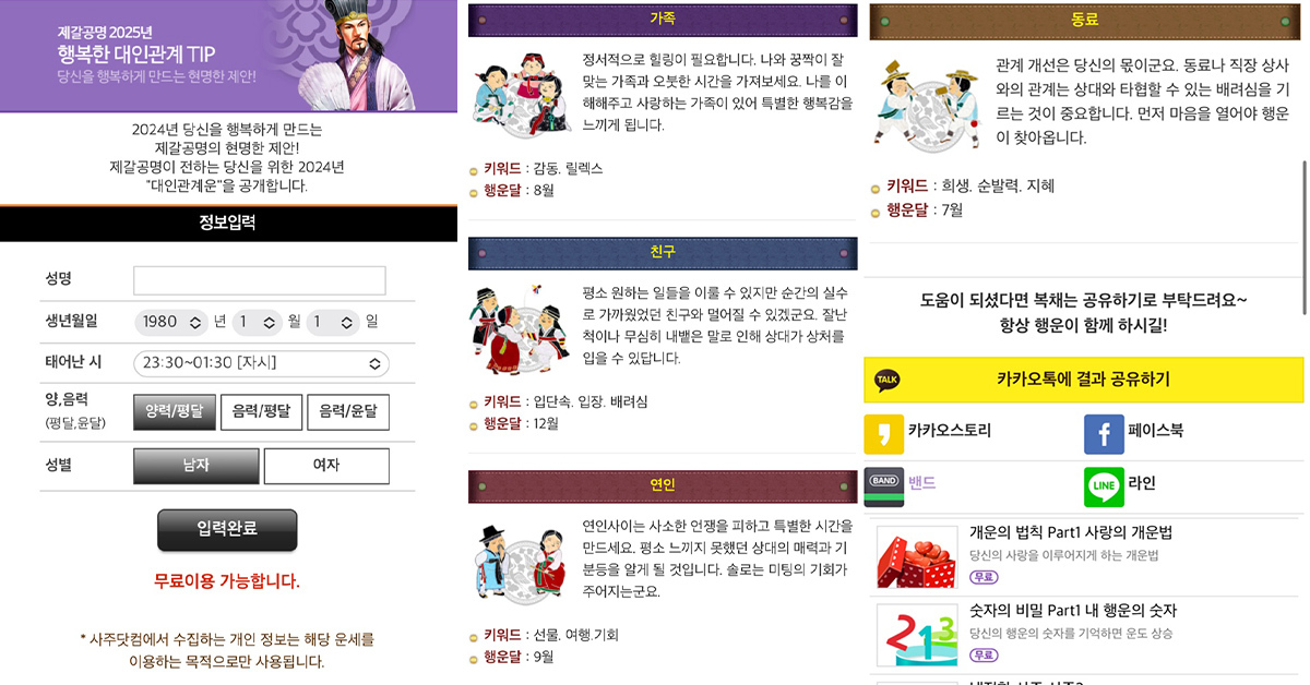 이는 바로 온라인 사주 전문 사이트 '위키사주'의 '제갈공명 2025년 행복한 대인관계 TIP'으로 무료로 이용할 수 있으며, 각 관계에서의 정리와 더불어 키워드, 그리고 행운의 달 까지 상세히 알려주고 있다.