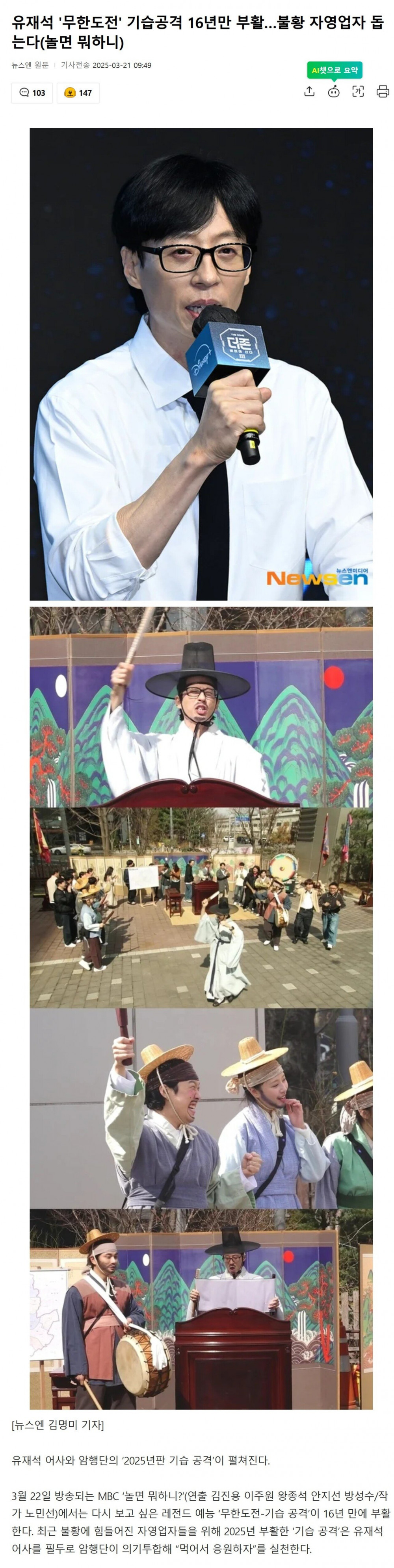 2009년 ‘무한도전’에서 선보인 박명수의 ‘기습 공격’은 불경기에 타격을 입은 음식점을 찾아가 먹어서 목표 매출액을 달성하는 미션을 펼쳤다. 당시 박 장군이 ‘기습 공격’을 이끌었다면, 2025년에는 유 어사가 출두해 ‘기습 공격’을 행한다.