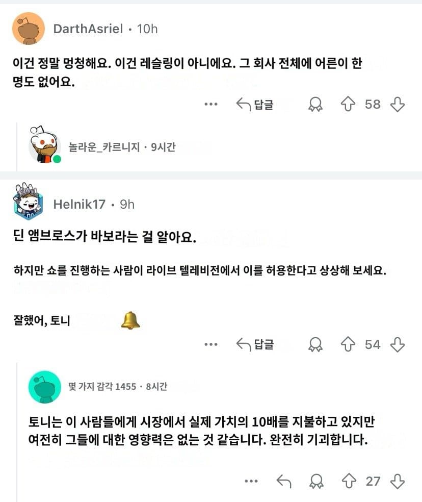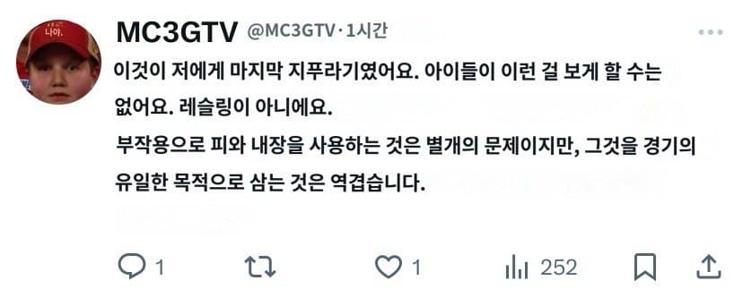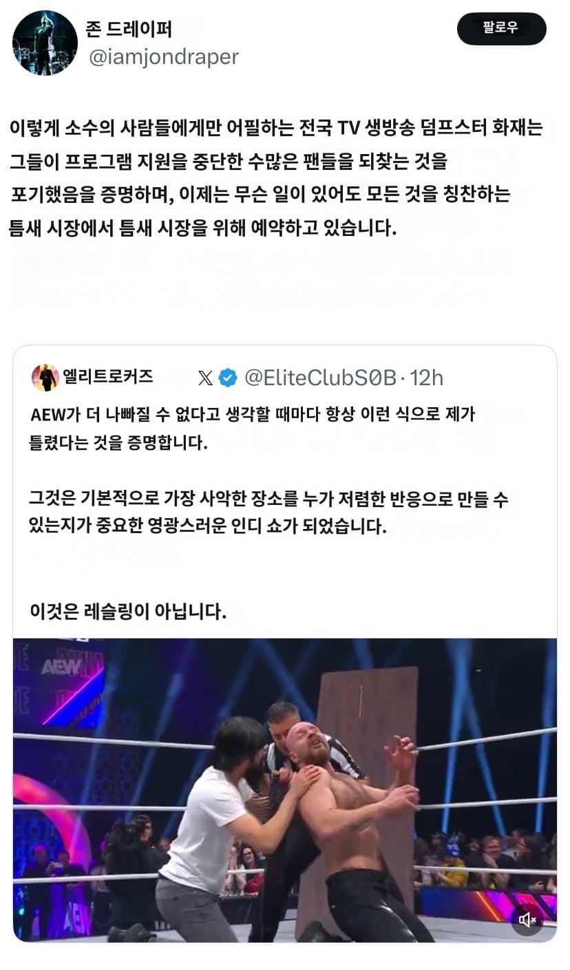 하드코어 스타일을 고집하겠다고 무리하게 심각한 척추 부상이나 파상풍 위험있는 행위를 링 위에서 저지름물론 팬들은 혹평 일색 스마트폰! 잠시 꺼두셔도 좋습니다옛날 사극 vs 요즘 사극 비교국가대표에 대한 "추신수"의 진심미국 메이저리그 구장 음식 수준가장 가난한 세대가 가장 부유한 세대를 책임져야 하는 아이러니