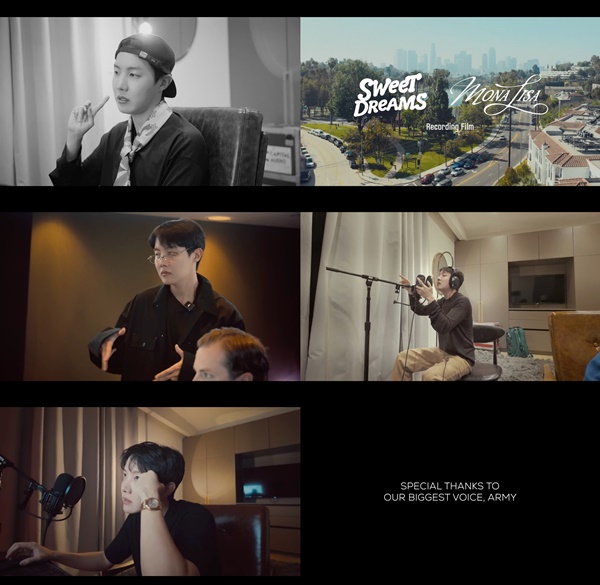 제이홉은 21일 오후 9시 방탄소년단 유튜브 채널에서 디지털 싱글 ‘Sweet Dreams (feat. Miguel)’와 ‘MONA LISA’의 녹음 비하인드 영상을 공개했다. 그는 음악 작업을 위해 미국으로 떠났고 “목표는 확실하다. 대중들이 즐기는 음악을 해보자는 것이 첫 번째였다”라며 당시의 마음가짐을 전했다.