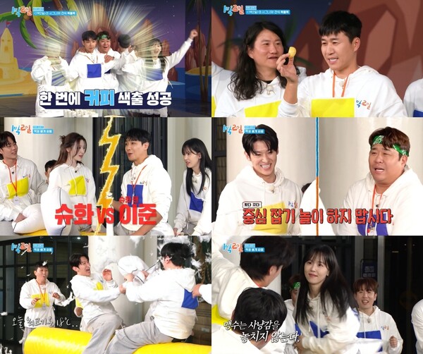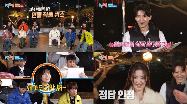 댄스 배틀을 통해 몸풀기를 마친 여섯 멤버와 친구들은 슈화 팀(문세윤·한해, 딘딘·덱스, 유선호·슈화)과 한나 팀(김종민·임우일, 조세호·남창희, 이준·강한나)으로 나뉘어 저녁식사 복불복에 나섰다. 3판 2선승제의 퀴즈 대결이 펼쳐진 가운데, 한나 팀은 1라운드에서 6:0 퍼펙트 승리를 거두며 기선제압에 성공했다.