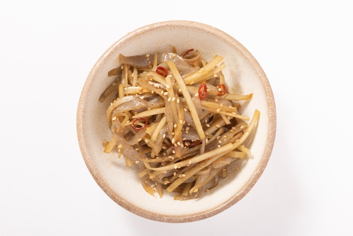 우엉을 채 썰어 간단하게 무쳐 먹으면, 아삭한 식감과 함께 새콤달콤한 맛을 즐길 수 있다. 소금물에 데친 후 참기름과 고춧가루, 마늘 등을 넣고 양념을 더하면 깔끔하고 입맛을 돋우는 반찬이 된다.
