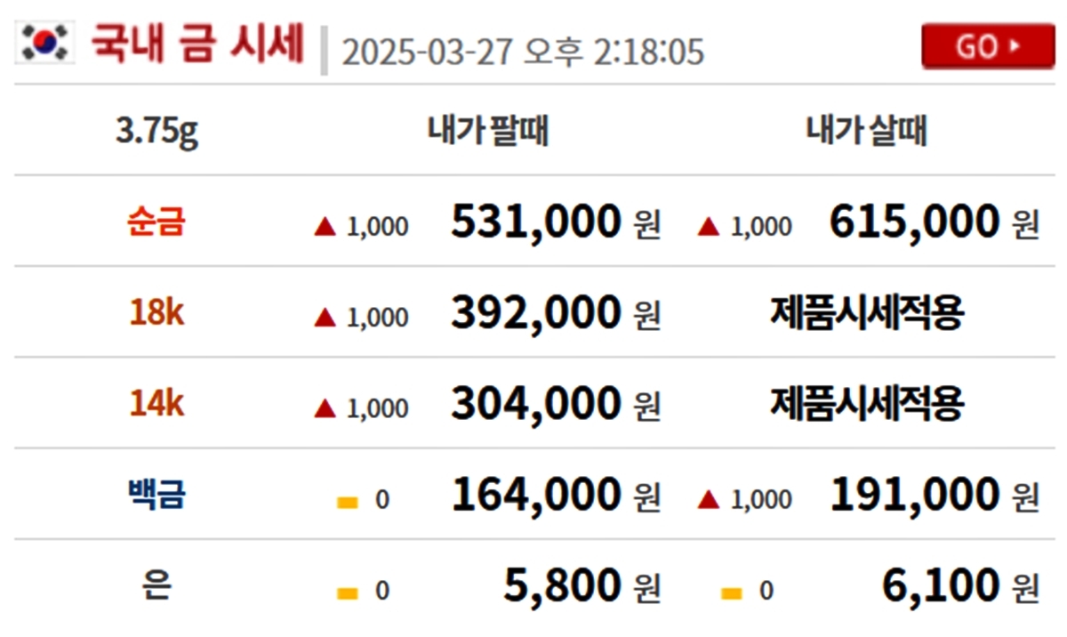 순금(24K) : 매입가 61만 5000원 / 매도가 53만 1000원