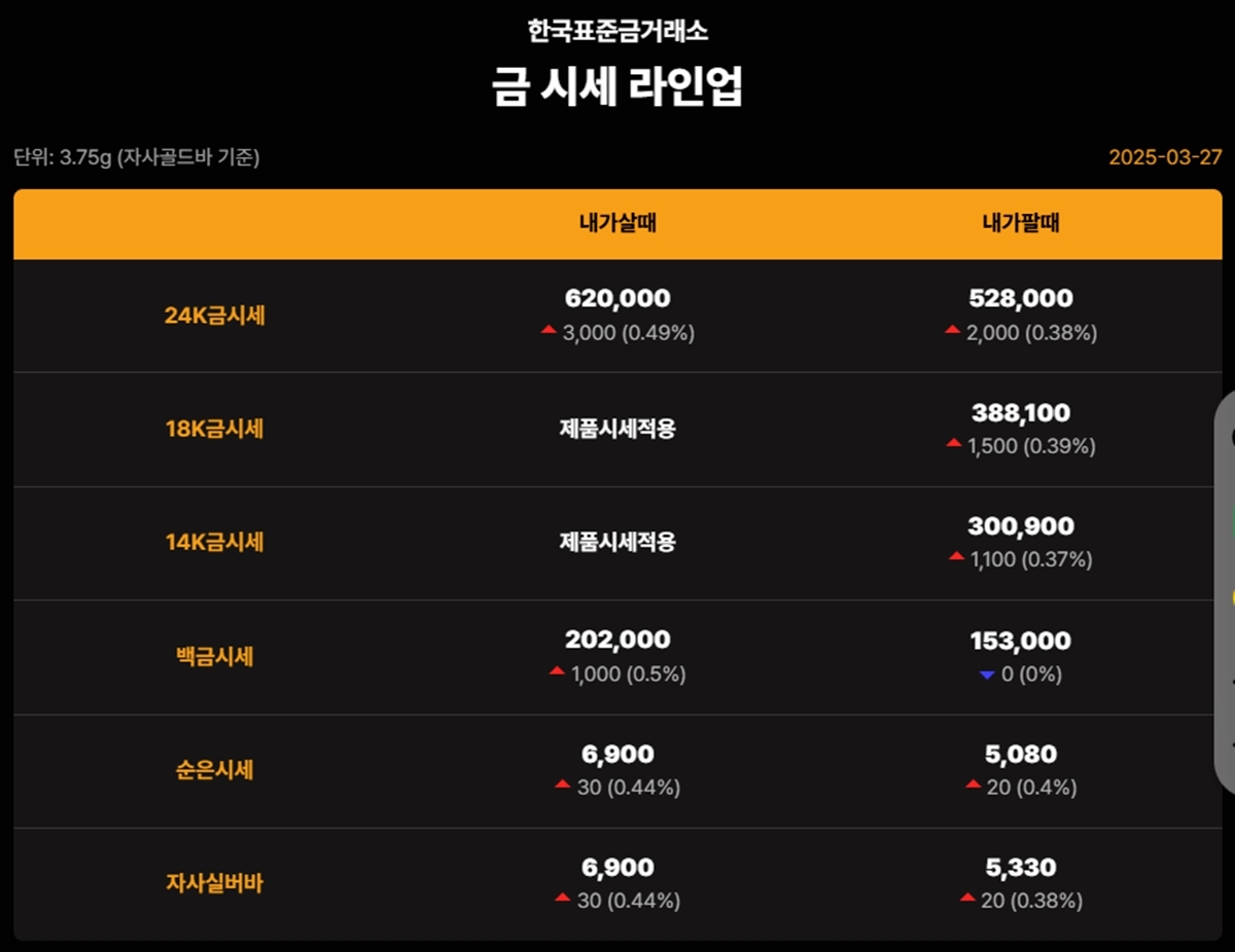 국내 금시세(금값)가 27일(한국 시각) 오후 상승세(전 거래일 대비)를 보이고 있다.