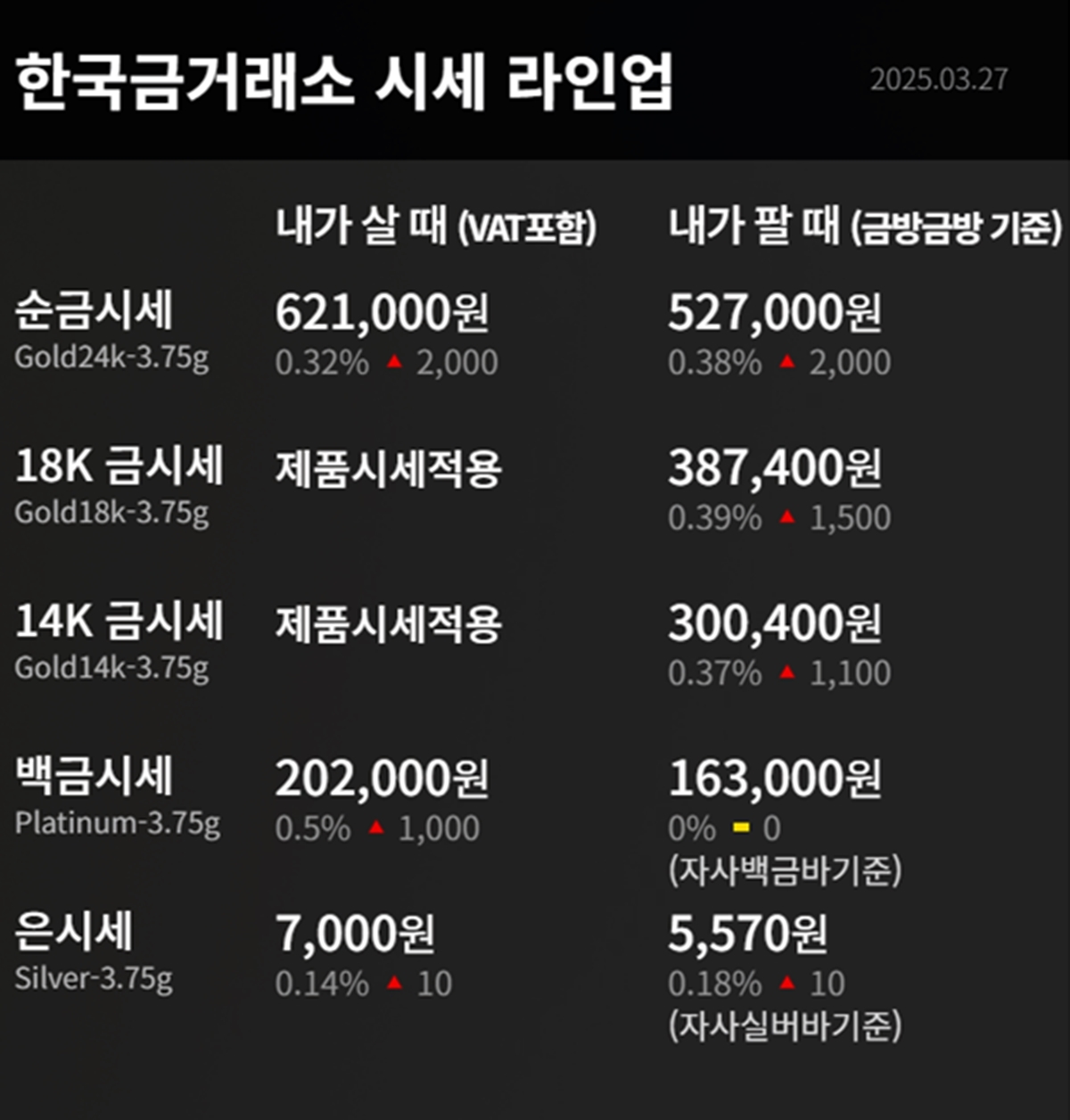 순금(24K) : 매입가 62만 1000원 / 매도가 52만 7000원