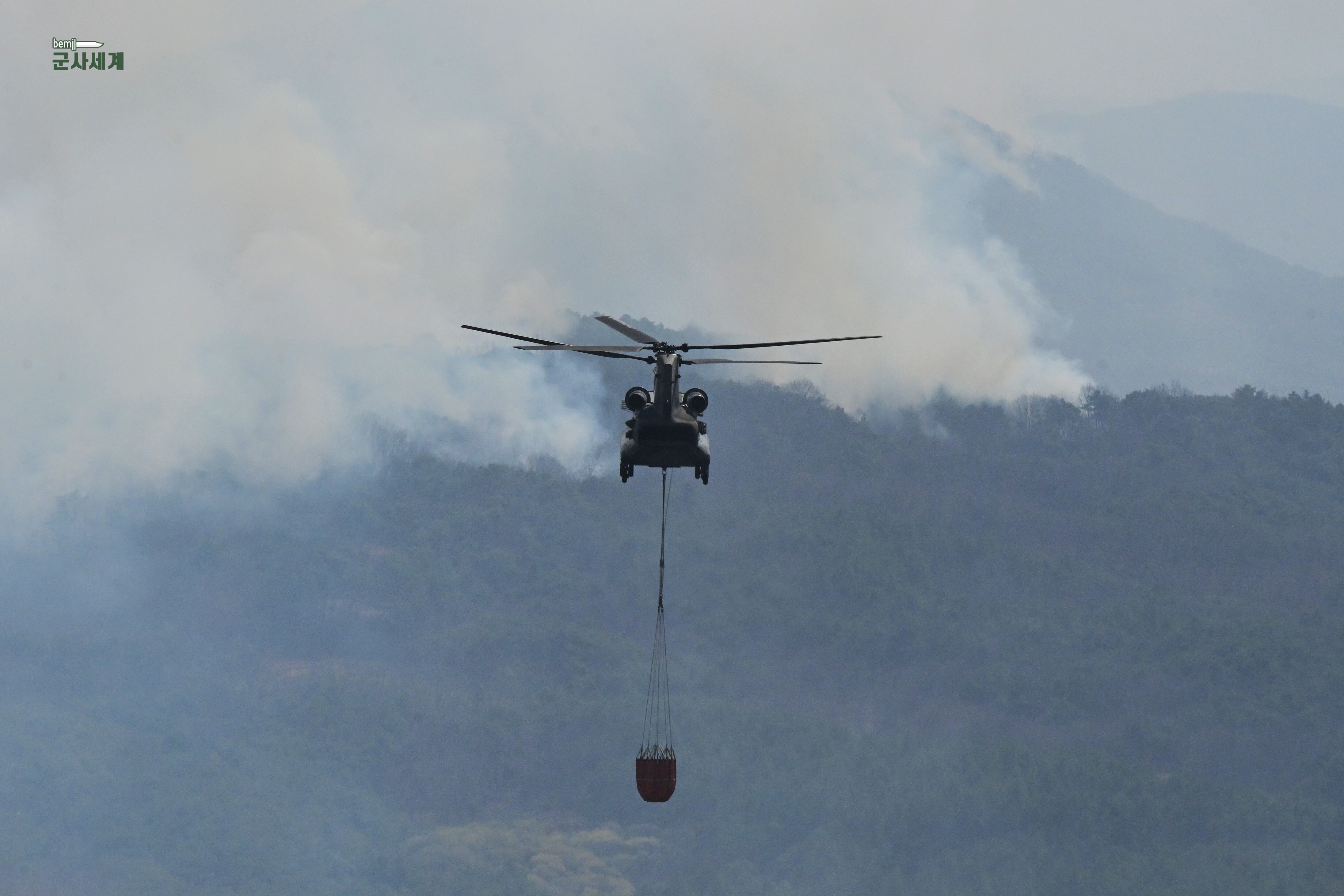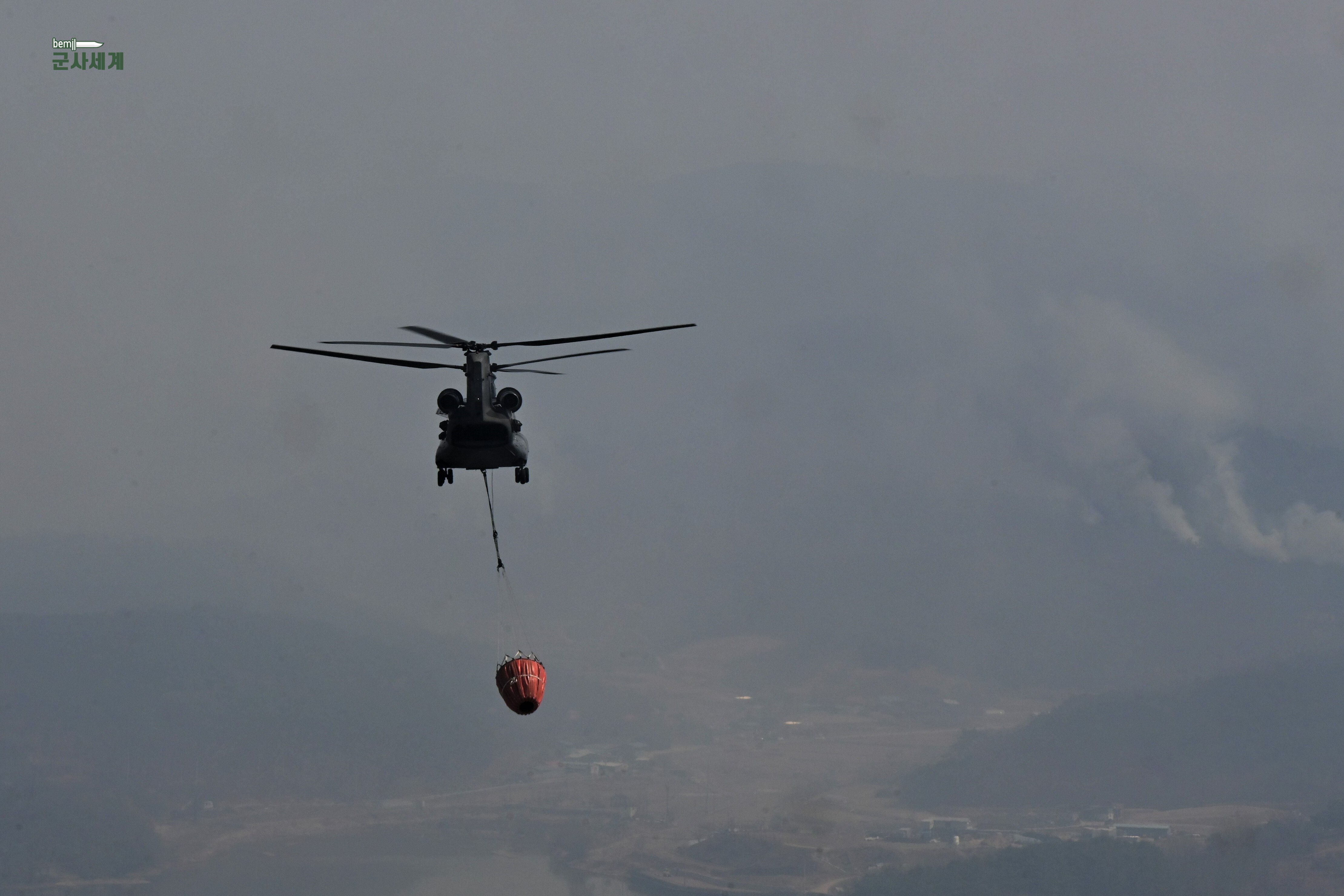 11) 공군 CH-47 헬기가 경북 의성군 화재지역에 물을 뿌리고 있다.