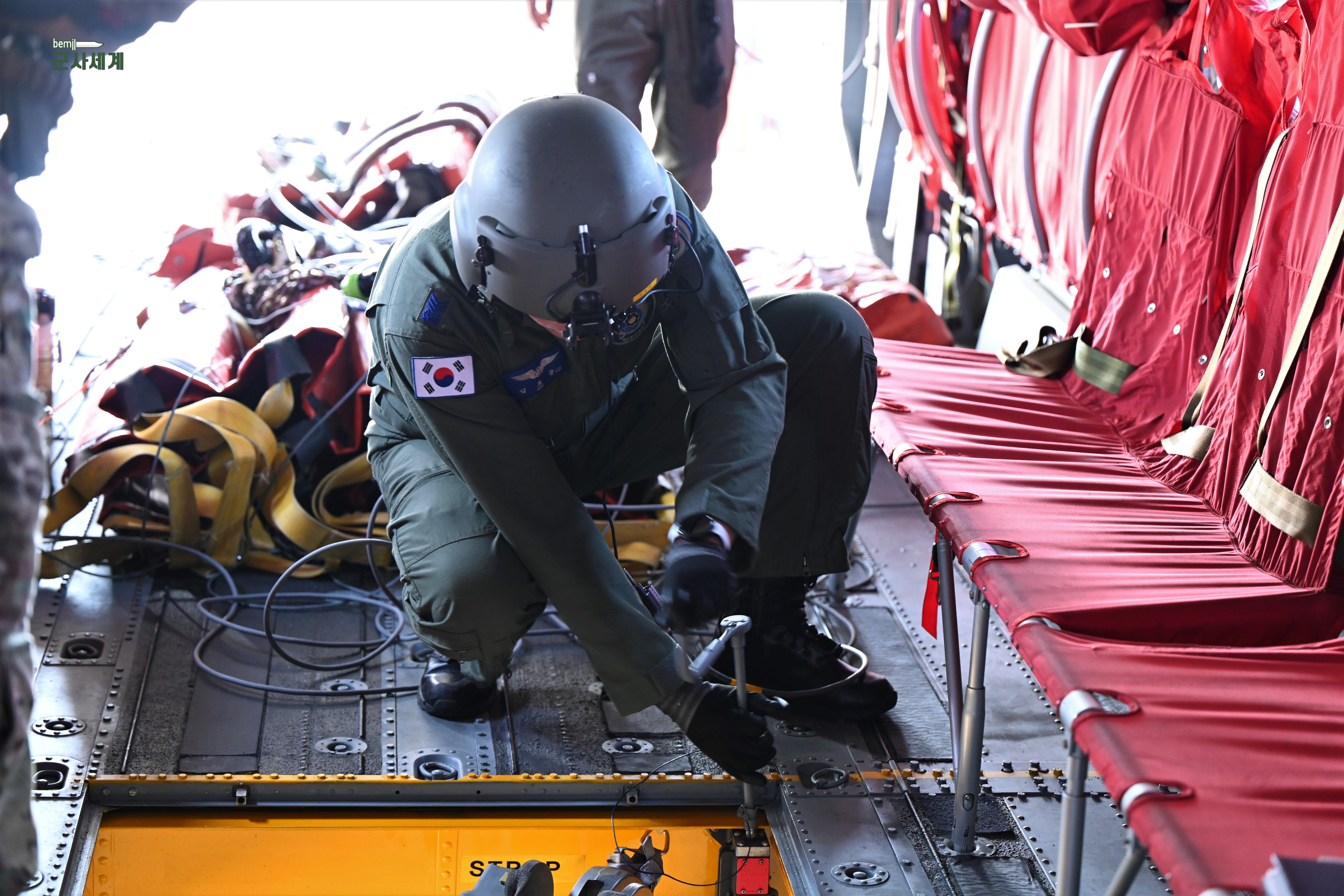 9) "제발 좀 불길이 잡혔으면..." 공군 항공구조사가 CH-47 헬기의 하부도어를 열고, 워터버킷(Water Bucket)의 물을 뿌릴 위치를 확인하고 있다.
