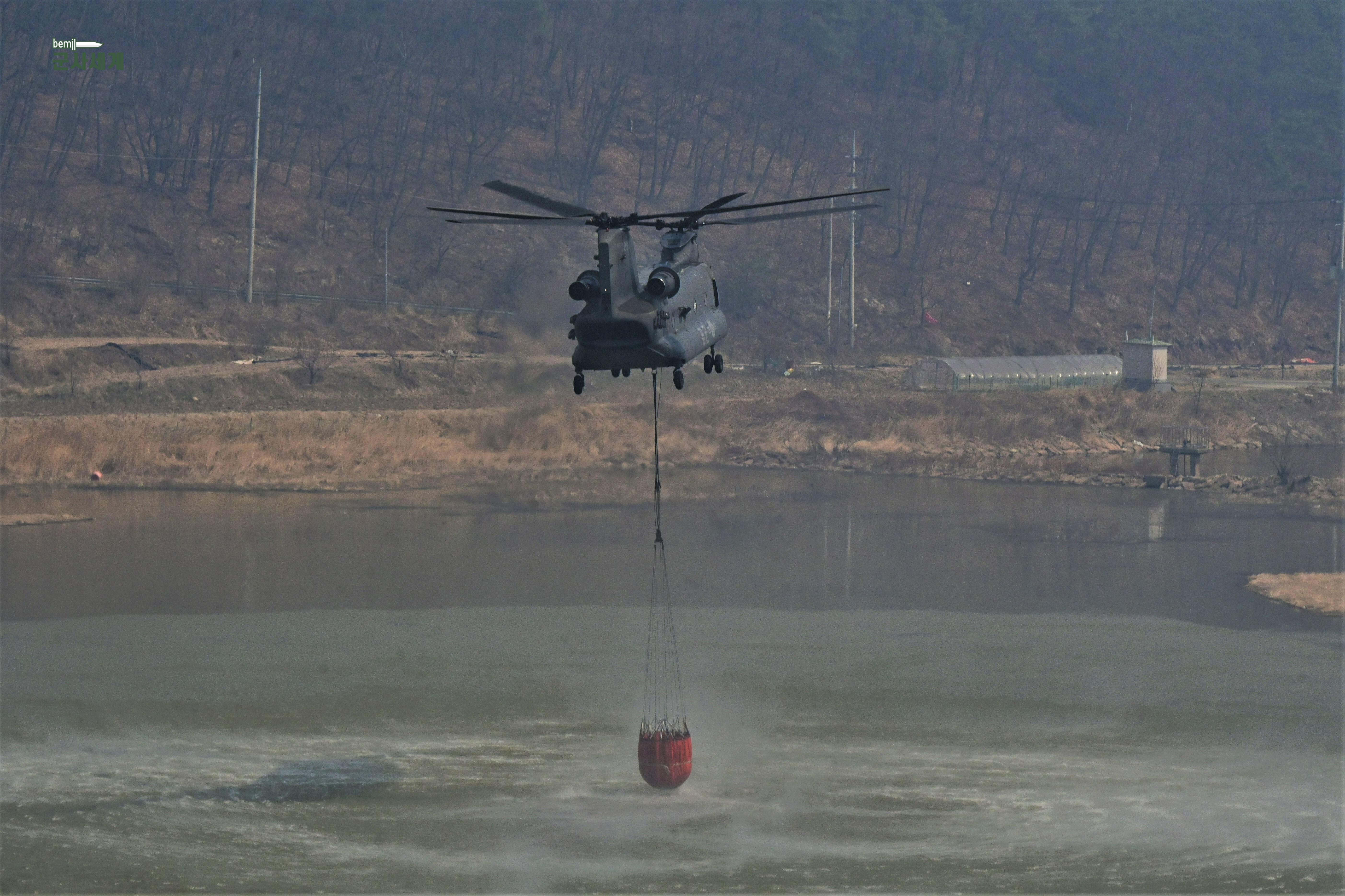 6) 공군 CH-47 헬기가 화재 지역에 워터버킷(Water Bucket)을 활용해 물을 뿌린 후 인근 저수지의 물을 다시 담고있다.