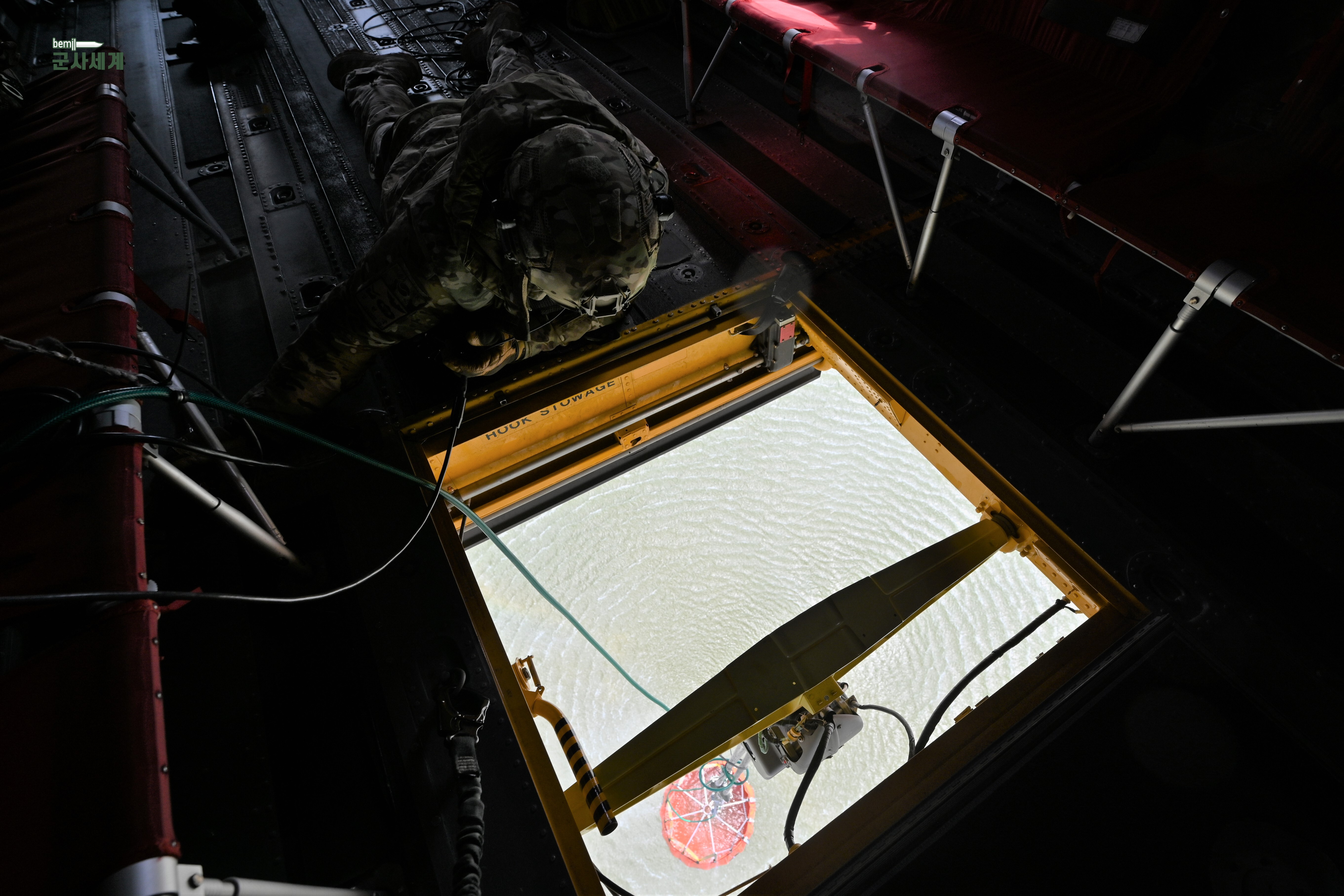 4) 공군 CH-47 헬기 정비사가 산불진화를 위한 워터버킷(Water Bucket) 탈착을 위해 하부 도어를 열고 있다.