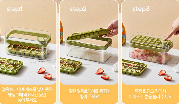 가장 큰 장점은 역시 '초스피드 초간편 얼음 빼기'다. 일반 트레이와 달리 원터치 한 번으로 힘을 들이지 않고도 64구의 얼음이 와르르 쏟아진다.