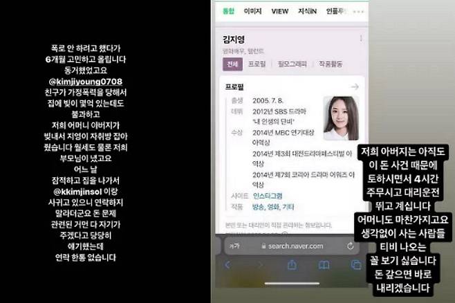 배우 김지영의 전 남자친구라 주장한 글쓴이는 자신의 SNS에 “김지영이 가정 폭력을 당해 집에 빚이 몇 억 있는데도 우리 부모님이 지영이 자취방을 잡아줘 동거했다”며 “어느 날 김지영이 잠적하고 집을 나가서 다른 사람과 사귀고 있으니 연락하지 말라더라”고 폭로했는데요.