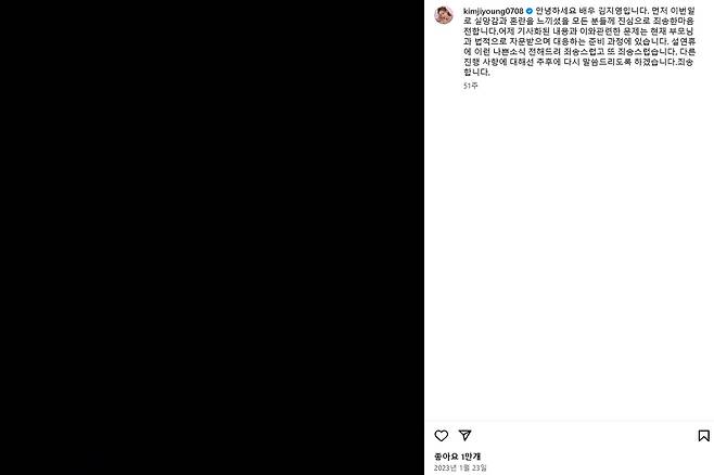이어 김지영은 자신의 SNS를 통해 “실망감과 혼란을 느끼셨을 모든 분들께 진심으로 죄송한 마음을 전한다”며 “기사화 된 내용과 관련한 문제는 현재 부모님과 법적으로 자문 받으며 대응하는 준비 과정에 있다”고 밝혔는데요.