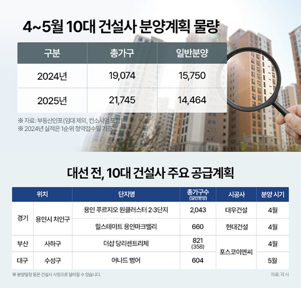 부동산시장 분석업체 부동산인포에 따르면, 6월 대선 직전까지 4~5월 2개월 간 2024년 도급순위 상위 10위 이내 대형 건설사의 브랜드 아파트는 총 2만1745가구가 분양될 계획인 것으로 나타났다(임대 제외, 컨소시엄 포함).