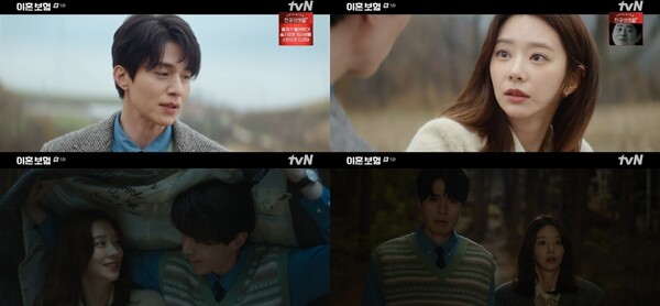 지난 14일 방송된 tvN 월화드라마 ‘이혼보험’(연출 이원석·최보경, 극본 이태윤, 기획 CJ ENM·스튜디오지니, 제작 몽작소·스튜디오몬도) 5화에서는 노기준(이동욱 분)과 강한들(이주빈 분)의 고군분투가 그려졌다. 구미래(한선화 분)의 남편 신현재(곽시양 분)를 찾기 위해 어느 시골 마을로 향한 노기준과 강한들. 어둑해진 산속에서 역대급 위기를 마주한 엔딩은 예측 불가의 전개를 예고했다.