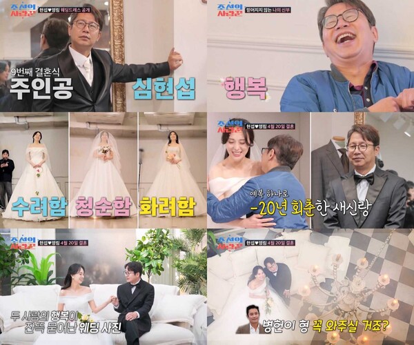 이후 심현섭의 예복도 공개됐다. 심현섭은 "내가 800쌍 넘게 사회 보면서 신랑 옷을 많이 봤지 않냐. 클래식한 게 제일 낫더라"라며 단번에 턱시도를 골랐다. 영상의 말미에는 두 사람의 웨딩 화보도 공개됐다. 심현섭은 "저 드디어 장가갑니다! 병헌이 형, 와 주실 거죠?"라며 마지막까지 '고등학교 1년 선배'인 배우 이병헌 섭외를 멈추지 않아 폭소를 자아냈다.