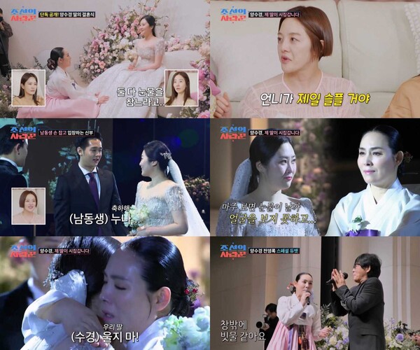 14일 방송된 ‘조선의 사랑꾼’에서는 '8090 레전드 가수' 양수경이 마음으로 품어 16년간 키운 딸 윤채영의 결혼식이 공개됐다. 신부 대기실에서 딸의 웨딩드레스 입은 모습을 마주한 양수경은 "울지 말자, 서로 코만 보자"며 눈물을 참았다. 하지만 시선을 마주치지 않는 노력(?)에도 눈시울이 붉어졌다. 이를 지켜본 '딸 맘' 강수지는 "(나중에) 신부 대기실에 들어가지 말아야겠다"며 과몰입해 웃음을 자아냈다.