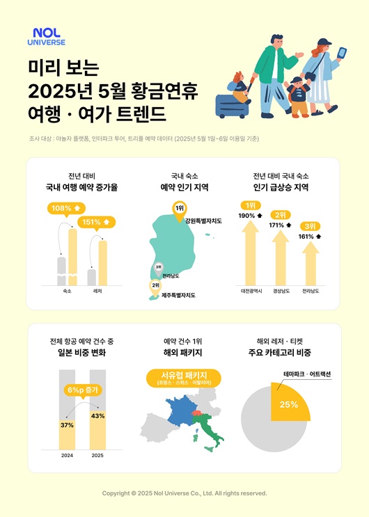긴 연휴를 효율적으로 활용하려는 수요와 문화 체험 및 자연 관광을 결합한 유럽 패키지 구성이 맞물려 높은 예약률로 이어진 것으로 분석된다. 해외 레저 카테고리에서는 테마파크ㆍ어트랙션 부문이 전체의 25%를 차지하며 사전 예약 1위에 올랐다.