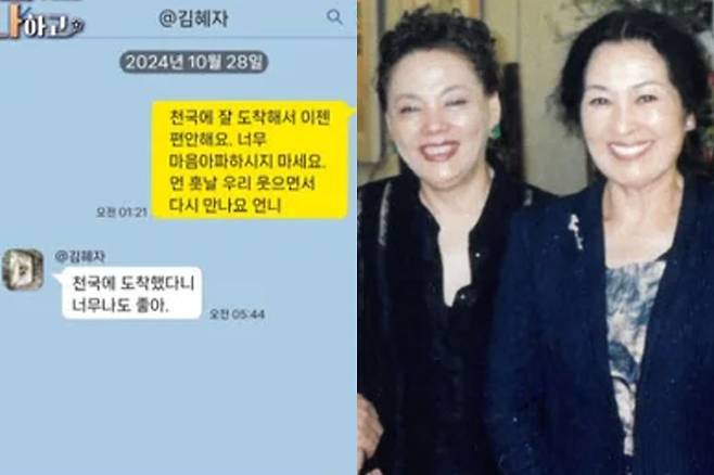 이어 "내가 답장을 보냈다. ‘천국에 잘 도착해서 이젠 편안해요. 너무 마음 아파하시지 마세요. 먼 훗날 우리 웃으면서 다시 만나요 언니’라고 보냈더니 김혜자 선생님이 ‘천국에 잘 도착했다니 너무나도 좋아. 수미야 안녕. 다음에 또 만나자’라고 보내주셨다"라며 울음을 참지 못했습니다.