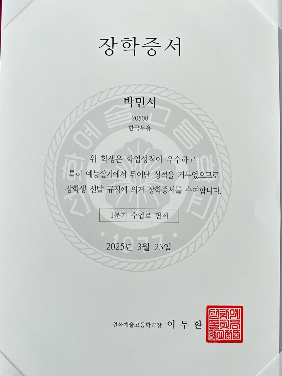 20일 한수민은 자신의 인스타그램에 "민서가 선화예술고등학교 입학해서 적응하는것도 힘들었을텐데 1학년 장학생으로 선발되었어요"라며 "실기와 학과를 합산하는 선발기준이 예원학교보다 매우 까다롭고 해서 이번에 무용과 전체(한국무용,발레,현대무용)에서 1명만 나왔는데 생각도 못했던 장학생이 되다니"라며 감격스럽다는 반응을 보였다.