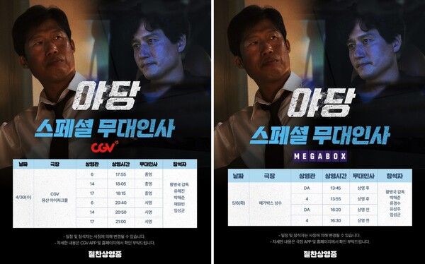 이어 5월 6일(화)에는 메가박스 성수에 박해준, 류경수, 유성주, 임성균, 황병국 감독이 방문해 관객들에게 아낌없는 팬서비스를 선사하며 큰 흥행을 만들어준 관객들에게 감사하는 시간을 갖는다.