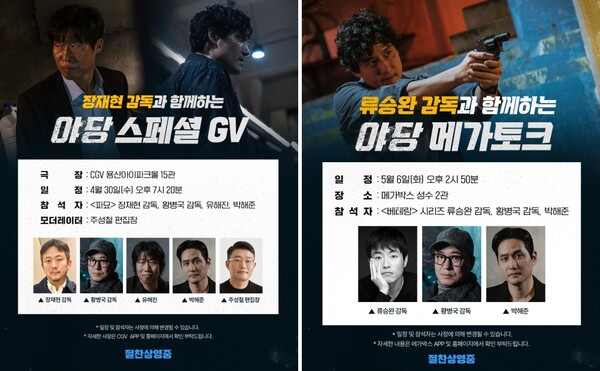 개봉과 동시에 8일 연속 전체 박스오피스 1위를 굳건히 지키고 있는 영화 '야당'이 '파묘'를 연출한 장재현 감독, '베테랑'을 연출한 류승완 감독과의 각각 스페셜 GV, 메가토크를 통해 관객들과 특별한 시간을 보낼 예정이다.