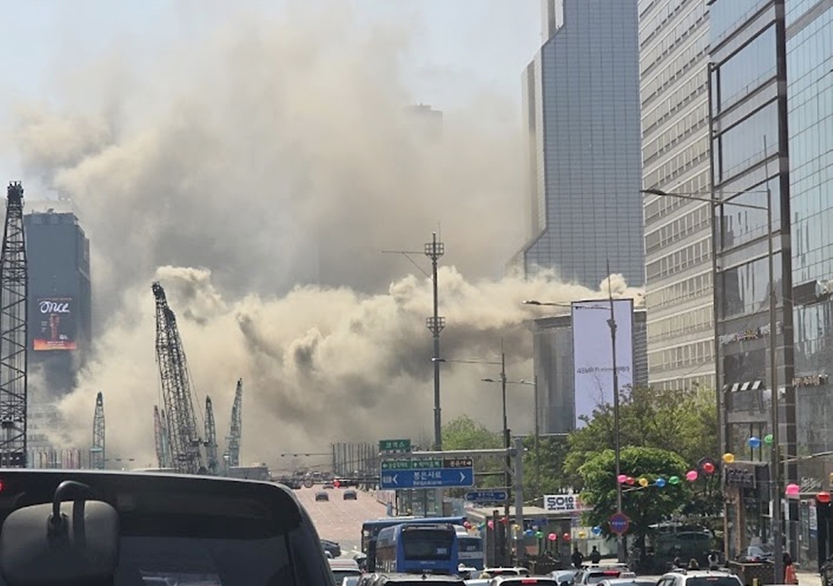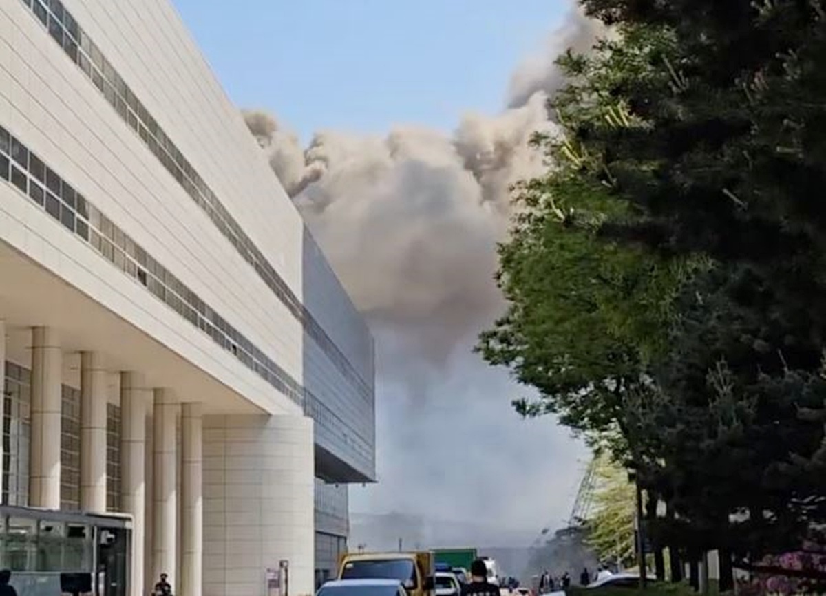 서울 강남구 삼성동 코엑스에서 화재가 발생했다. 코엑스 건물에서는 많은 양의 연기가 피어오르고 있다.