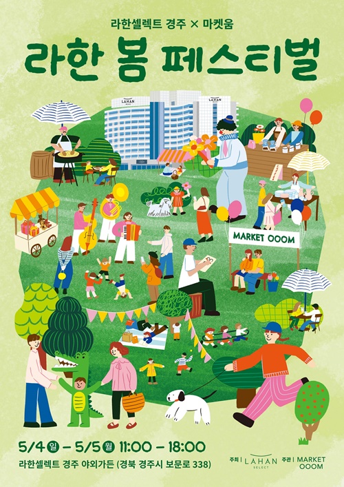 라한셀렉트 경주에서 5월 4일과 5일 ‘라한 봄 페스티벌’이 열린다. 이틀 동안 오전 11시부터 오후 6시까지 열리는 ‘라한 봄 페스티벌’은 야외 가든에서 펼쳐진다. 국내 최대 규모의 플리마켓을 운영하는 마켓움과 함께 풍성한 볼거리와 즐길거리를 선사한다. 올해는 리빙&라이프, 키즈&체험, 푸드, 펫 등 다양한 분야의 예술가와 플리마켓 셀러 70여 팀과 함께 개성 가득한 볼거리를 선사할 계획이다.