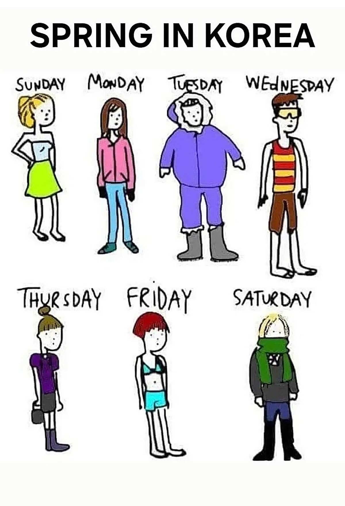 한국의 봄날씨를 소재로 한 유머러스한 일러스트가 해외와 한국의 인터넷 커뮤니티에서 큰 화제를 모으고 있다. 이 그림은 '스프링 인 코리아(SPRING IN KOREA)'라는 제목 아래 일주일 동안 매일 다른 계절의 옷차림을 한 캐릭터들을 보여준다.