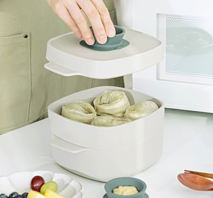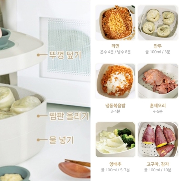 불 앞에서 조리하거나 찜솥을 꺼내는 등 번거로움 없이 전자레인지에 돌리기만 하면 되고 만두, 호빵, 남은 음식을 데울 때 등 물컵을 두거나 비닐에 씌우지 않아 편하다.
