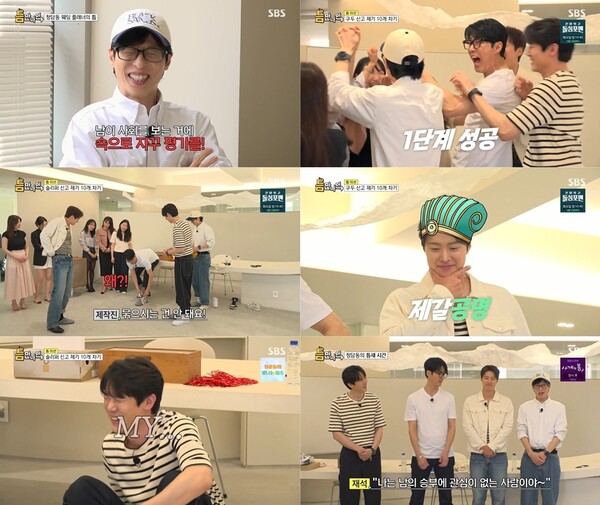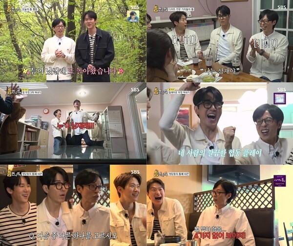 지난 6일(화) 방송된 SBS ‘틈만 나면,’(연출 최보필/작가 채진아)은 일상 속 마주하는 잠깐의 틈새 시간 사이에 행운을 선물하는 '틈새 공략' 버라이어티. 21회에서는 돌아온 2MC 유재석, 유연석과 함께 ‘틈 친구(게스트)’ 차승원, 공명이 출격해 잡지사와 웨딩 컨설턴트사의 틈새 시간을 왁자지껄한 웃음 대침투 케미로 사로잡았다.