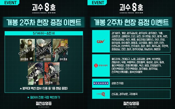 각 엽서에는 강렬한 인상의 방위대원들이 괴수를 토벌하기 위해 무기를 들고 의미심장하게 대기하고 있는 모습을 담았으며 영화 로고에 후가공 효과가 추가되어 특별함을 더한다. 방위대원들의 개성과 존재감을 고스란히 담아낸 2주차 특전에 관한 자세한 사항은 극장 홈페이지를 통해 확인할 수 있다.